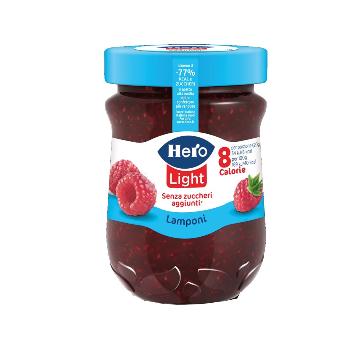Hero Light ai Lamponi è una confettura con pochissime calorie! Non contiene zuccheri aggiunti, ma solo quelli naturalmente presenti nella frutta.