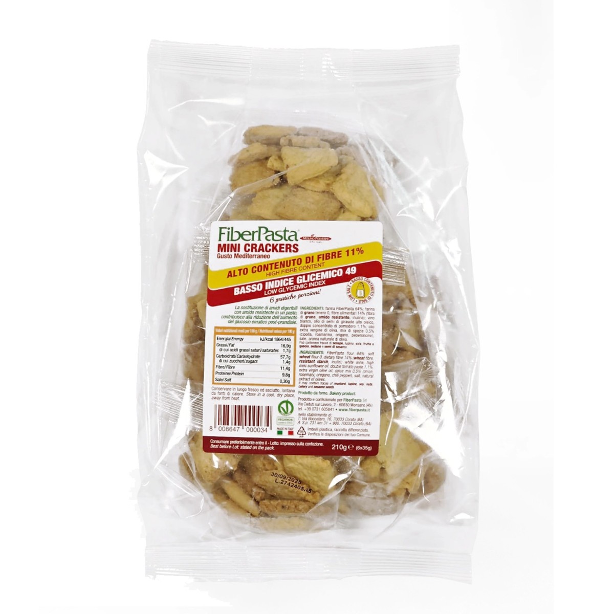 +39 328 102 6993I Mini Crackers gusto Mediterraneo IG 49 hanno un elevato contenuto di fibre (11%) tra cui fibre funzionali quali amido resistente e inulina.