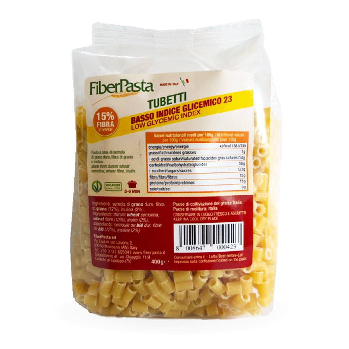 La pasta FiberPasta contiene il 15% di fibra (oltre il doppio della pasta integrale tradizionale), un basso indice glicemico IG 23 ed è ottenuta esclusivamente da semola di grano duro con l’aggiunta funzionale di inulina (fibra vegetale solubile). L’elevato contenuto di fibra aumenta la sazietà senza provocare gonfiore e rallenta l’assorbimento dei carboidrati, contribuendo ad un minor assorbimento calorico e alla riduzione del picco glicemico.