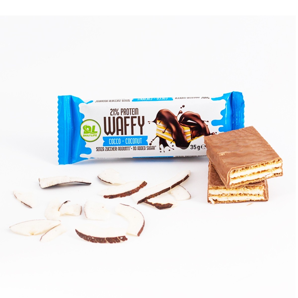 Ogni barretta ha una copertura di finissimo cioccolato al latte ed un doppio ripieno proteico racchiuso fra tre croccanti sfoglie di wafer! Grazie alla loro praticità, i Waffy sono perfetti non solo per chi è sempre in movimento, ma anche per coloro che, comodamente seduti, vogliono godersi un momento di delizioso piacere. Il nostro wafer è disponibile in tre deliziose varianti: Nocciola, Vaniglia-Cannella, Cocco.