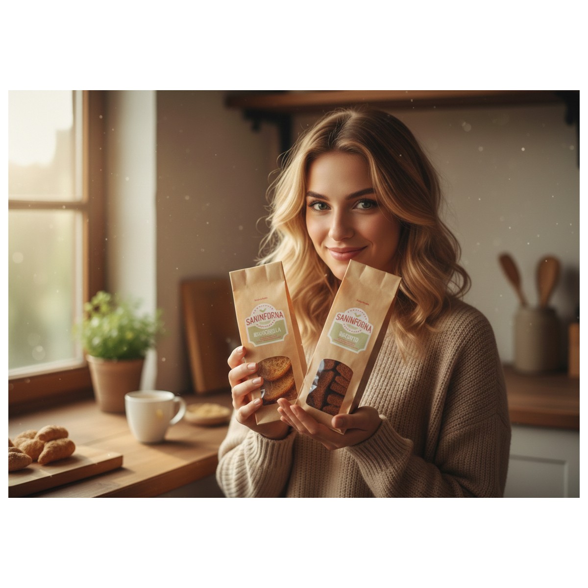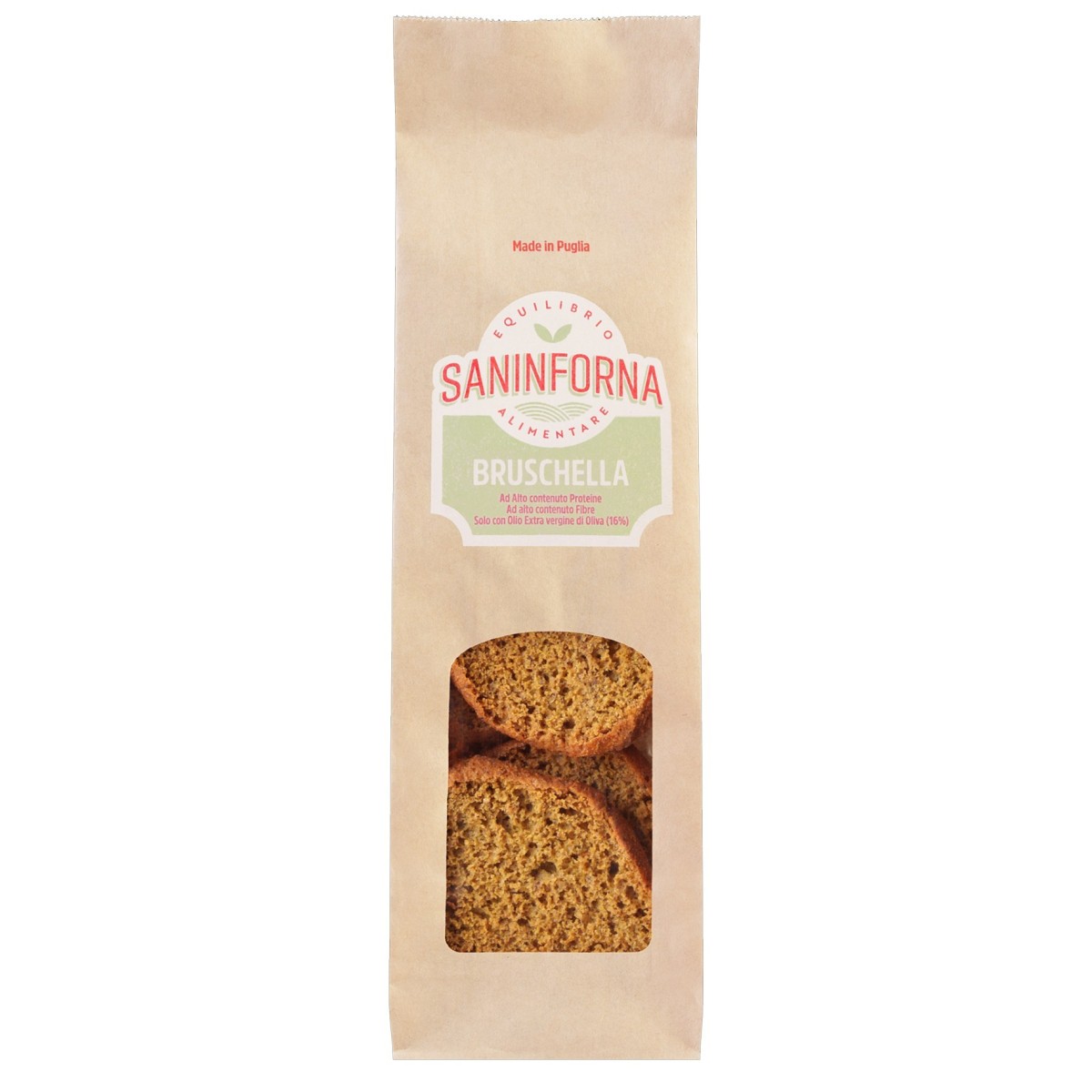La Bruschella Saninforna è realizzata con farine del territorio pugliese a basso contenuto di glutine, arricchita con proteine vegetali di lupino.