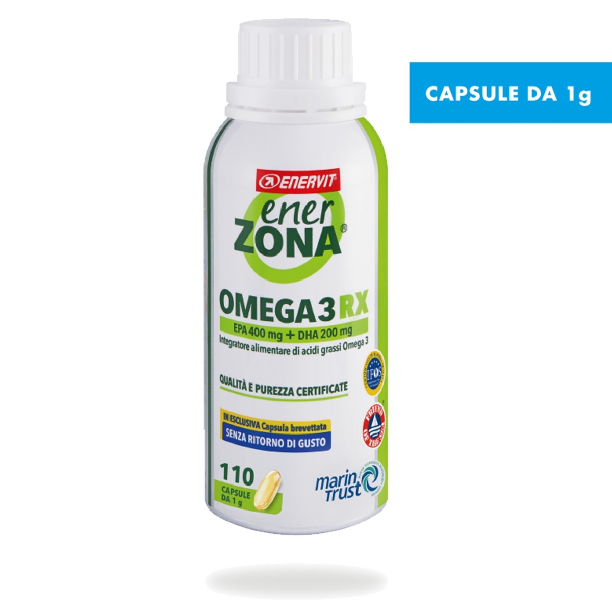 Gli omega 3 sono acidi grassi definiti ‘essenziali’ in quanto il nostro corpo non è in grado di produrli da sè, ma sono fondamentali per i numerosi benefici che apportano all’organismo: si prendono cura di cuore, vista e cervello, contribuiscono a mantenere normali i livelli di trigliceridi nel sangue e una normale pressione sanguigna. Assimilali attraverso l’alimentazione, in caso di un apporto ridotto o di un aumentato fabbisogno, mediante l’integrazione*. L’integratore EnerZona Omega3 RX in capsule, è un prodotto di eccellenza: altamente certificato, riconosciuto per la sua qualità e purezza, l’unico con capsula brevettata senza ritorno di gusto e leader nel mercato italiano* da 15 anni. L’integratore EnerZona Omega3 RX, in capsule da 1 g, ha un dosaggio ottimizzato di EPA e DHA in rapporto 2:1 (400mg di EPA e 200mg di DHA), per permetterti di assumerlo in modo pratico e veloce.