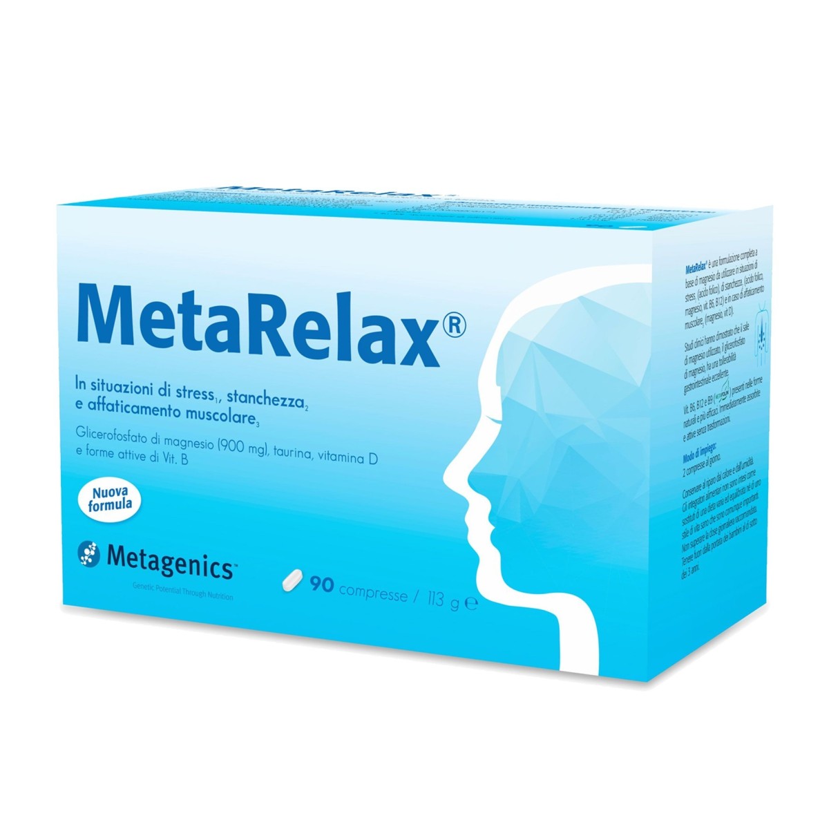 MetaRelax® è una formulazione completa a base di magnesio da utilizzare in situazioni di stress (folato), di stanchezza (folato, magnesio, vit. B6, B12) e in caso di tensione muscolare (magnesio, vit. D).